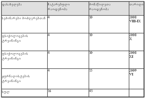 2008 წ. ოქტომბერ-2009 წ. მარტში _ პროექტი "შიდა ქართლის რეგიონიდან დევნილი მოსახლეობის და საომარი ზონიდან დაბრუნებული სამხედრო კონტინგენტის ფსიქო-სოციალური რეაბილიტაცია" გორში, მიმდებარე სოფლებსა და საგურამოში (471 ბავშვისა და მათი მშობლების ფსიქო-სოციალური დახმარება, თემის 22 ლიდერის ტრენინგი, 7 თვითდახმარების ჯგუფის ორგანიზაება), ქუთაისში (100 ადამიანი) განსახლებულ იძულებით გადაადგილებულ პირთა და ომის ზონიდან დაბრუნებული სამხედრო კონტინგენტის (4 სამხედრო ბატალიონი _ 150 ჯარისკაცი) ფსიქო-სოციალური რეაბილიტაცია განხორციელდა. პროექტის დასრულების შემდგომ, 4 ყველაზე წარმატებული მოხალისე დასაქმდა (ავიყვანეთ სამსახურში).
